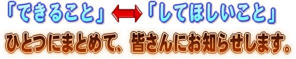 また、人材バンクをつくったのはいいけれど活動する場がないのでは、せっかくの皆さんのお気持ちが無駄になってしまいます。そんなことにならないよう、「してほしいこと」のリストを作成し、皆さんにお知らせしてゆきます。「できること」「してほしいこと」をセンター事務局がとりまとめをする役になって、人と人との心の交流を応援してゆきたいと考えています。