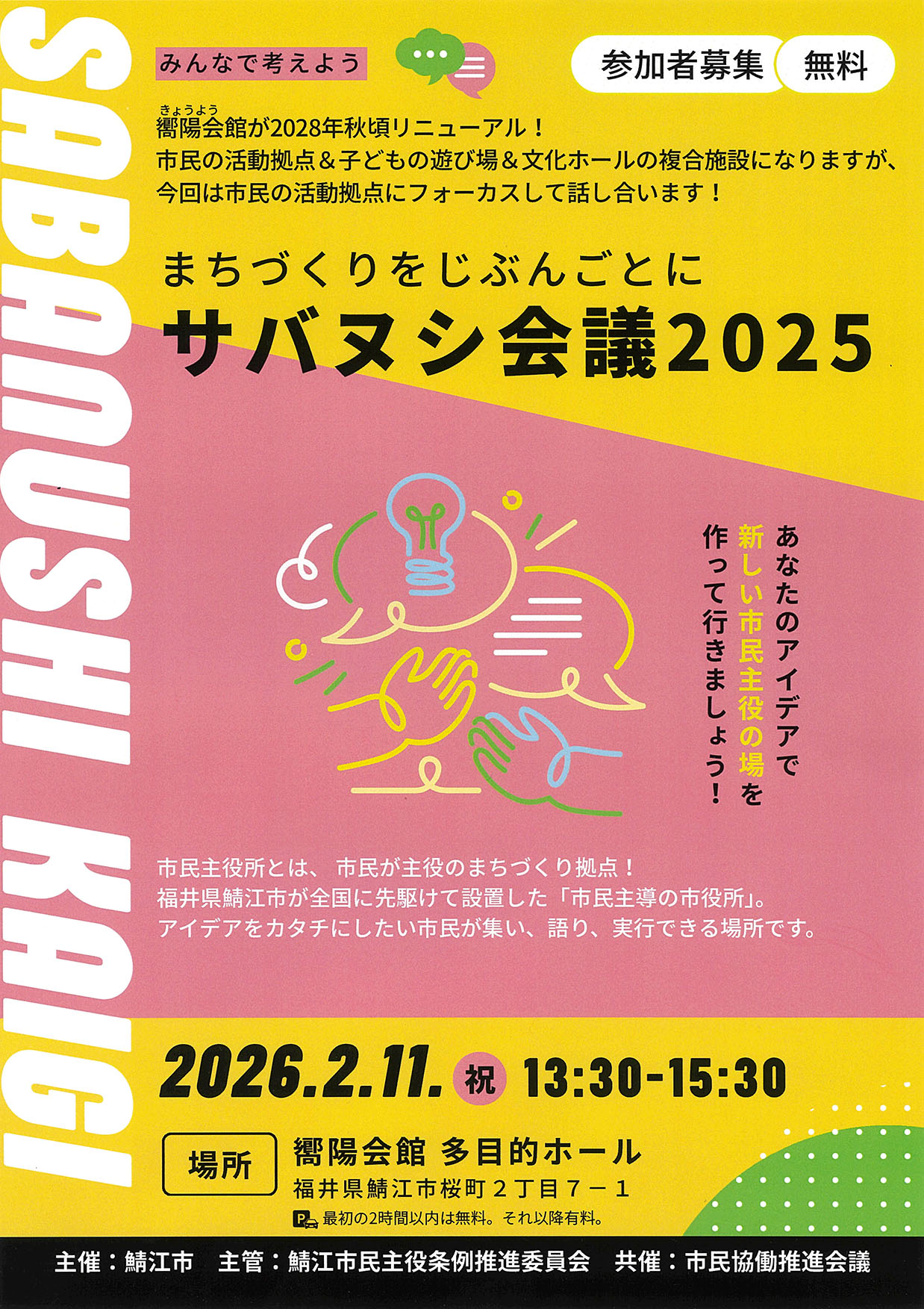 | 本文 | ●まちづくりをじぶんごとに 鯖江市桜町にある嚮陽会館が2028年秋頃にリニューアルします。 「市民の活動拠点」「子どもの遊び場」「文化ホール」の機能を持つ“複合施設”に生まれ変わりますが、今回の「サバヌシ会議」では、「市民の活動拠点」にフォーカスして話し合います! あなたのアイデアで、新しい市民主役の場を作っていきましょう! ■日時 2026年2月11日(水・祝) 13:30〜15:30 ■場所 鯖江市 嚮陽会館 多目的ホール ※駐車場は2時間まで無料/それを超えると24時間まで300円 ■参加費 無料 ■対象 興味のある方ならどなたでも ※市外の方でもOKです ■チラシ(JPEG) こちらのリンクからご覧ください ■主催 鯖江市 ■主管 鯖江市民主役条例推進委員会 ■共催 鯖江市民協働推進会議 |