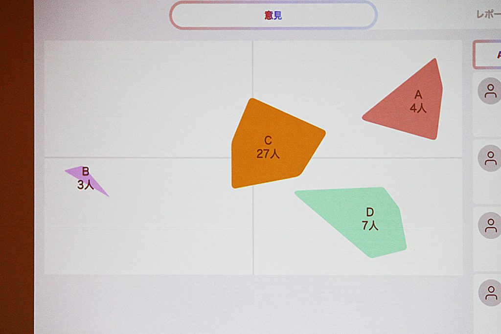 投稿された内容から、わかりやすい「勢力図(グループ分け)」が図形的に表示され、参加者の“傾向”が直観的に理解できます。
